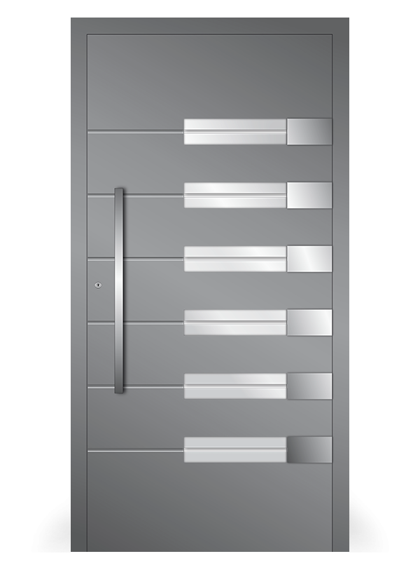 Tehnologija izdelave aluminijastih vrat Despiro je omogočila učinek enakomerne površine. Tu je krilo skrito za okrasnimi ploščami. Na voljo imamo široko paleto izvedb plošč – z zasteklitvijo, aplikacijami iz nerjavečega jekla ali okrasnim rezkarjem.
